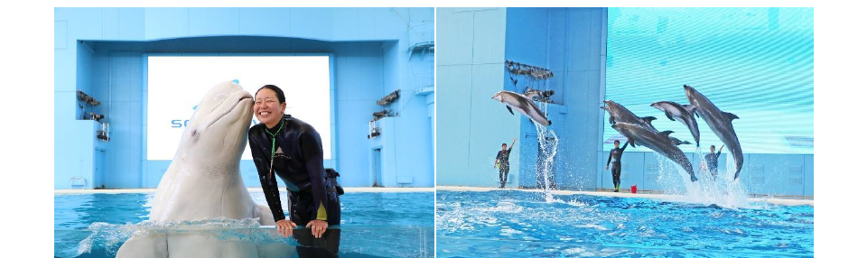 イルカたちがくらすプールでイルカたちの生態を学びながら、ふれあったり、ごはんをあげたり、ほっぺにキスしてもらったりすることができます。さらに、バンドウイルカの背びれにつかまってスピード感のある泳ぎを体感したり、シロイルカの背中に乗ってお写真を撮ることも!