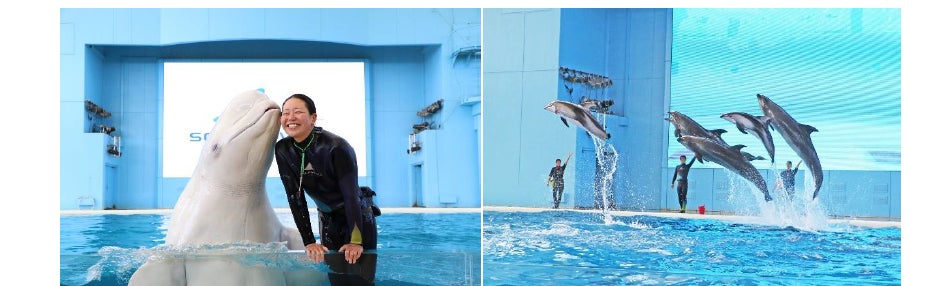 生きものとさまざまなふれあい体験が楽しめる水族館「ふれあいラグーン」のホエールオーシャンでは、シロイルカとバンドウイルカによる「スプラッシュタイム」を開催いたします。