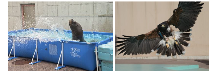 水族館「ふれあいラグーン」では、オタリア(アシカの仲間)、ケープペンギン、コツメカワウソ、ハリスホークなどの鳥類が登場する「アニマルパフォーマンス」が夏期限定で夏フェス仕様になり、さまざまな生きものたちが体はクールに、心はホットになるパフォーマンスをお届けいたします。メインパートでは体重約200kgのオタリアが大きくパワフルな前肢を動かして大量の水の塊をプレゼント!ハリスホークなどの鳥類はお客さまの頭上すれすれを飛んでいくなど、生きものたちを間近で感じることができます。