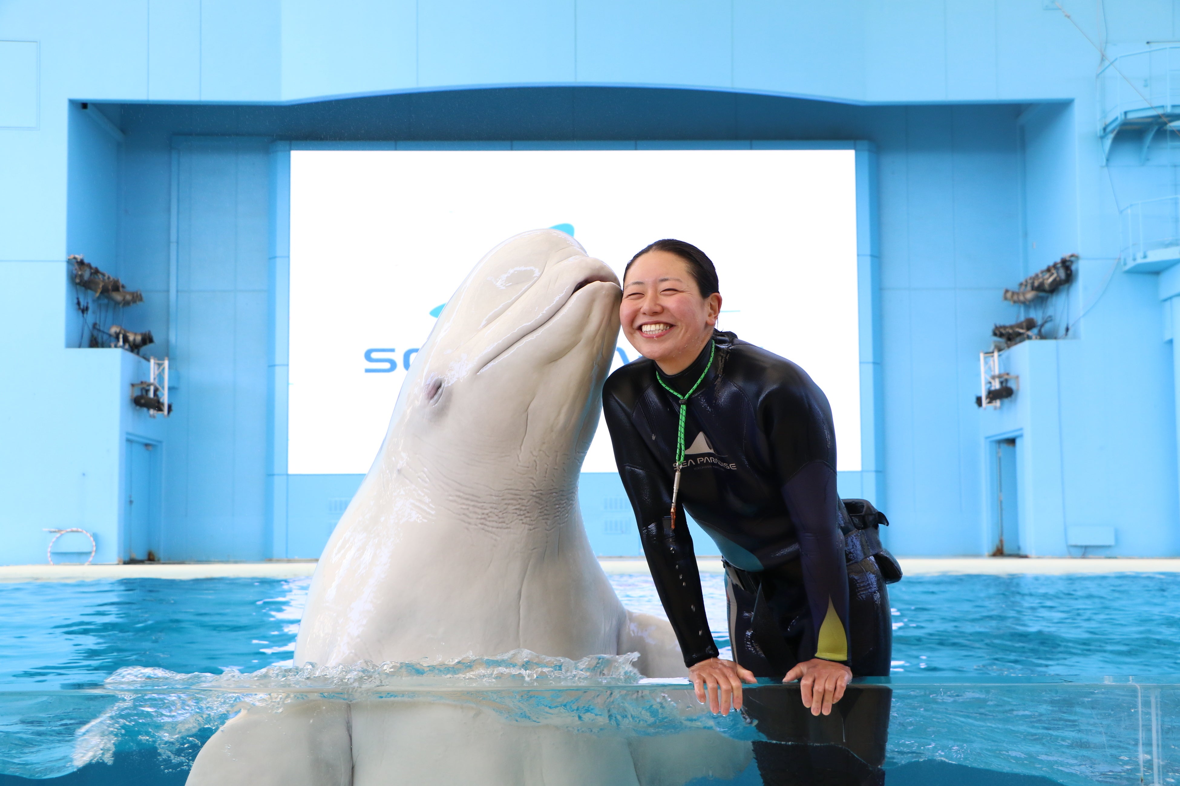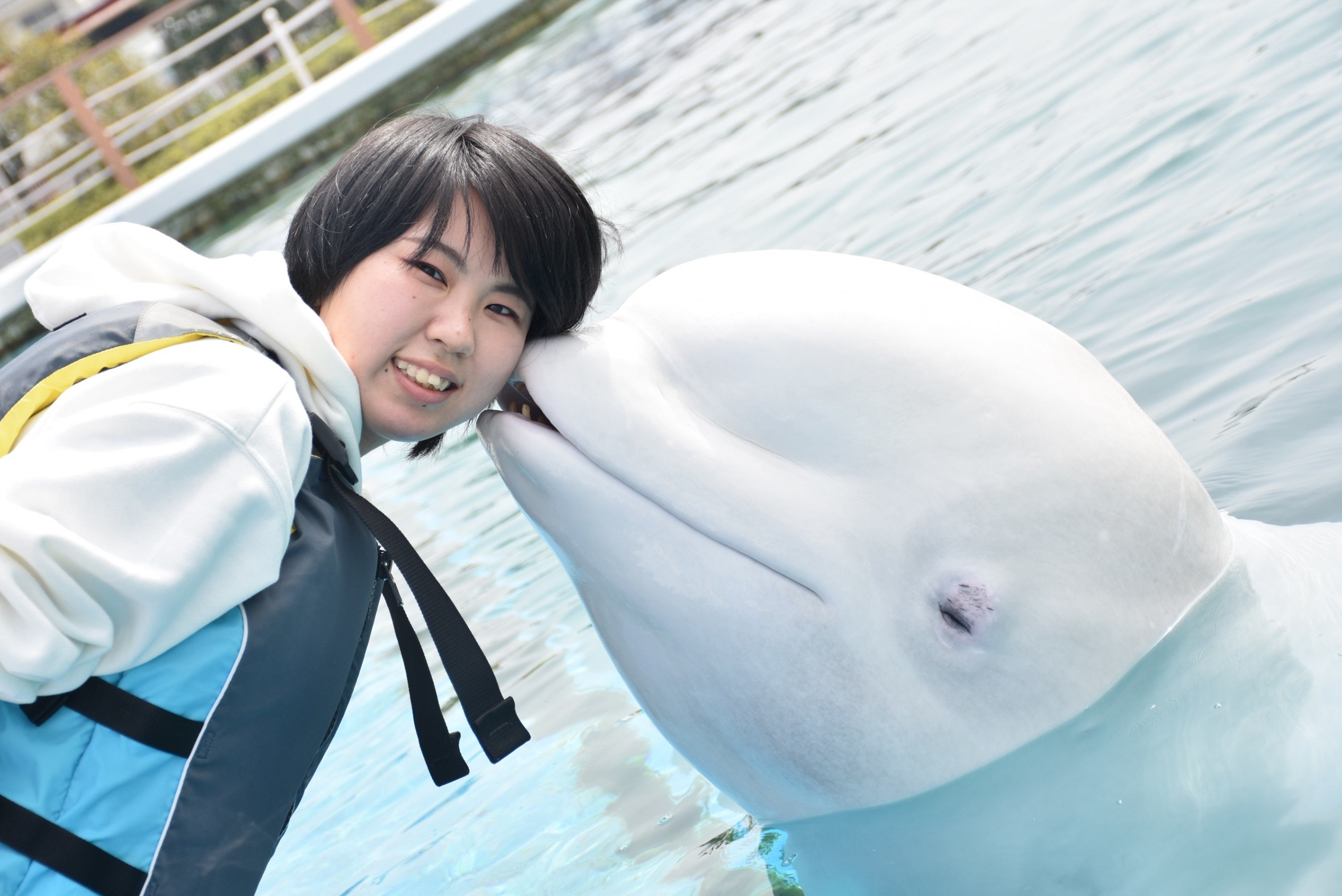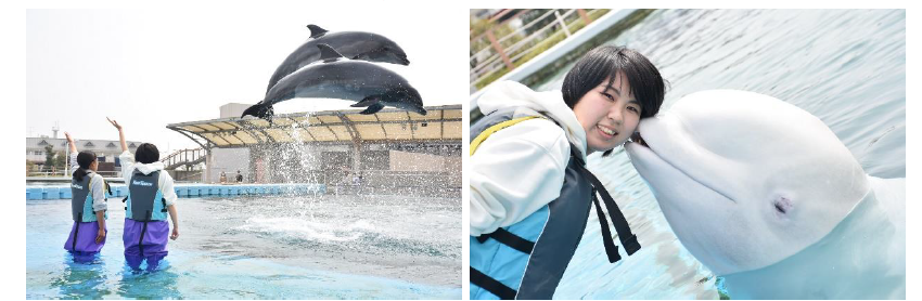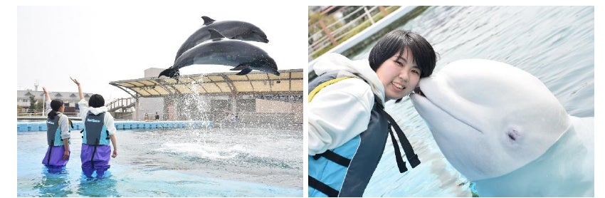 胴長を着用し、イルカたちのくらすプールで飼育員から健康チェックやトレーニングを学びながら、イルカとふれあったり、ごはんをあげたり、ジャンプの合図などを出すことができるプログラムです。イルカに関する知識を学びながら、ドルフィントレーナーになった気分が味わえます。バンドウイルカ、シロイルカからキスのプレゼントも!