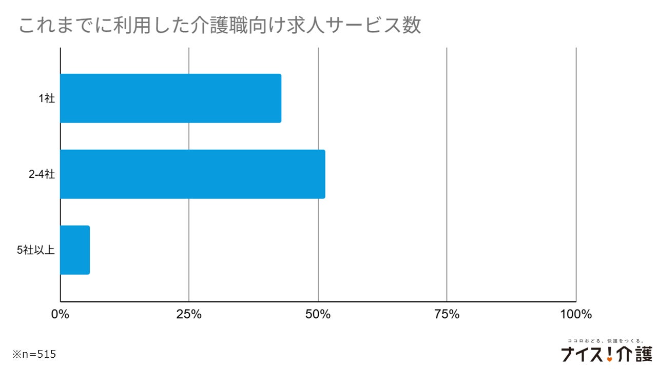これまでの求職活動において利用した介護職の求人サービスについて尋ねたところ(※過去に利用したサービスを含む)、利用サービス数は「1社」が42.9%、「2~4社」が51.3%、「5社以上」が5.8%という結果となりました。2社以上のサービスを利用した経験がある求職者は、全体の57.1%と約6割にのぼりました。