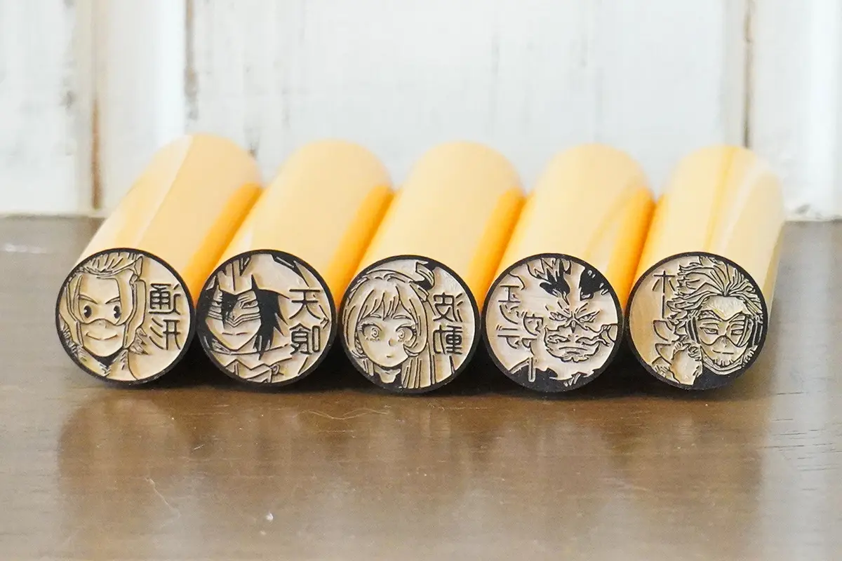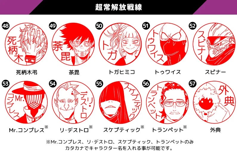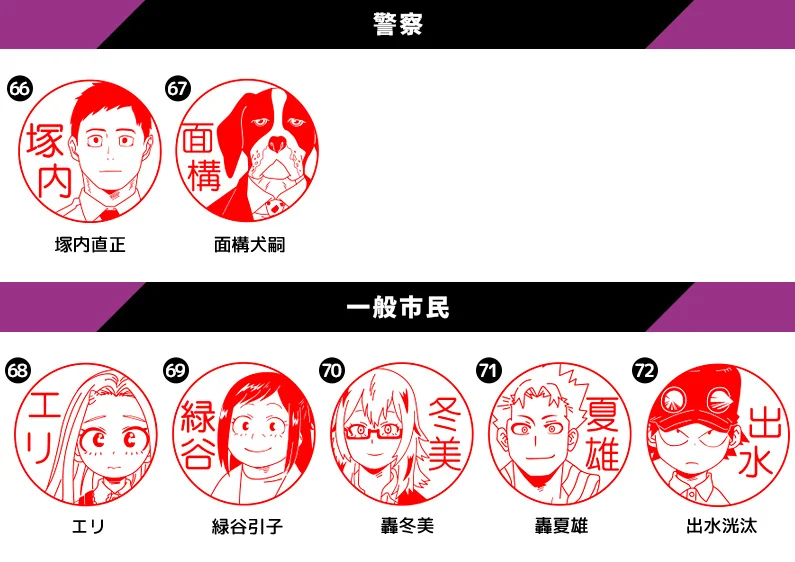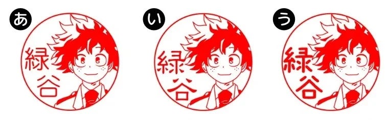 SNSよりリクエストをいただいていたエンデヴァーやホークス、心操人使など34キャラが追加され、総勢106種類に。ヒロアカ好きにはたまらない、実用OKのはんこです。