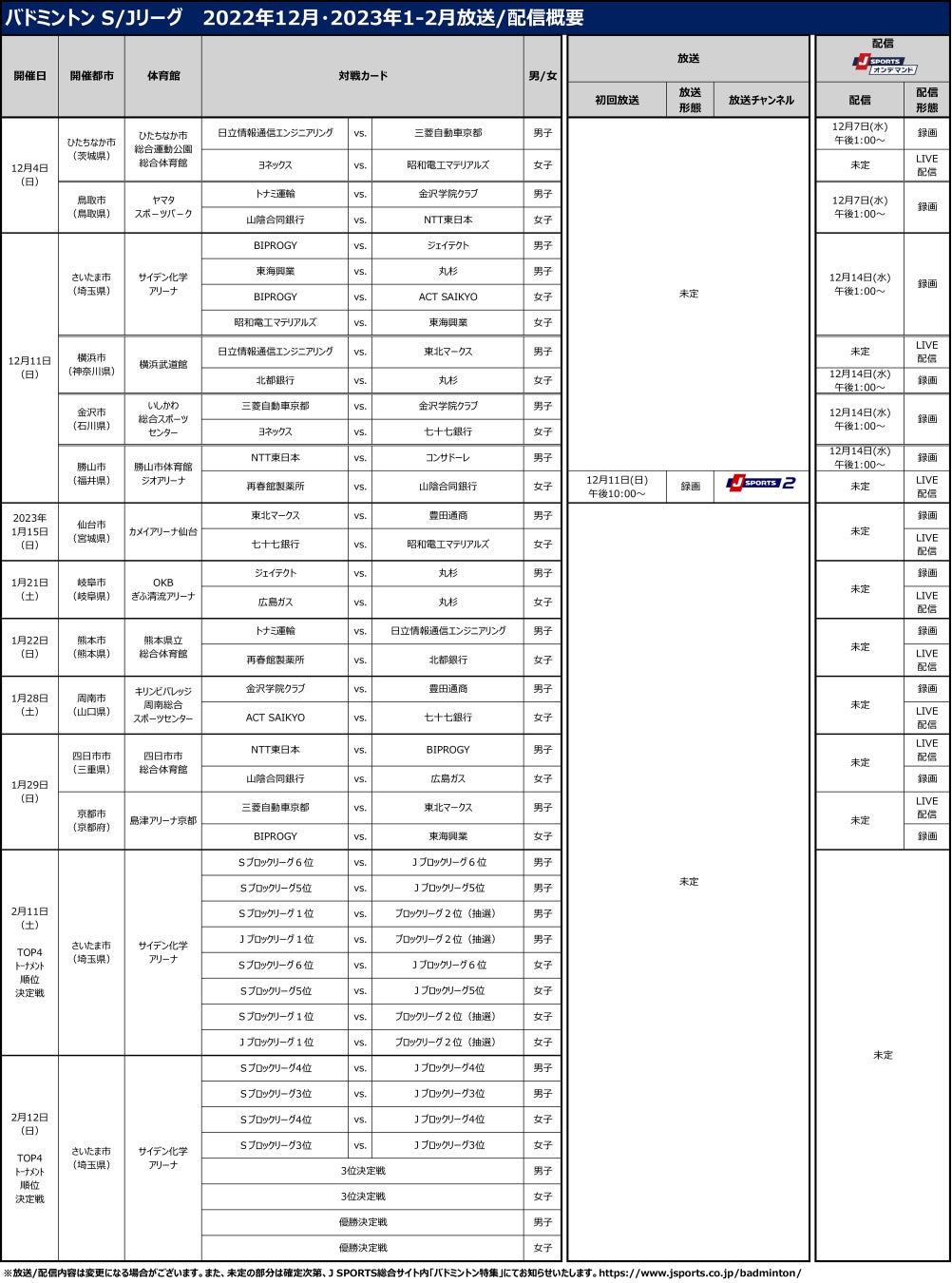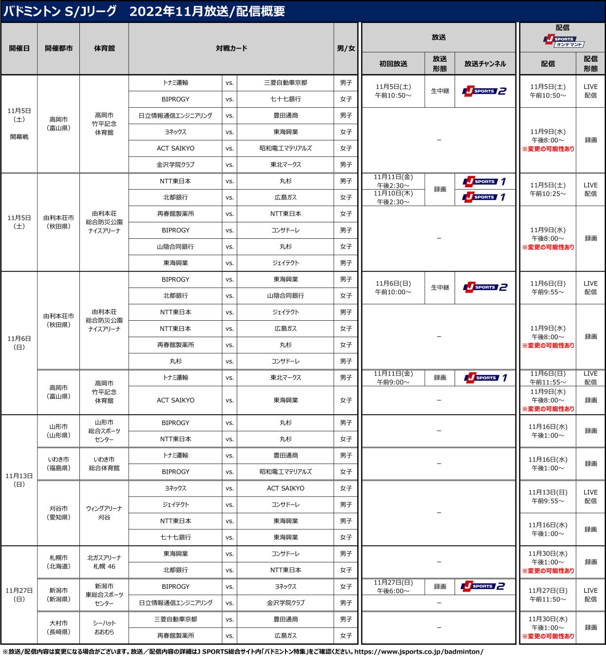 国内最大4チャンネルのスポーツテレビ局、株式会社ジェイ・スポーツ(本社 東京都江東区、代表取締役社長 長谷 一郎、以下「J SPORTS」 ※1)は、11月5日(土)に開幕する国内最高峰のリーグ戦 「バドミントンS/Jリーグ2022」をPC、スマホ、タブレットで見られる動画配信サービス「J SPORTSオンデマンド」 ※2で開幕戦からTOP4トーナメントまで全試合配信します。また注目試合は実況・解説付きで放送します。