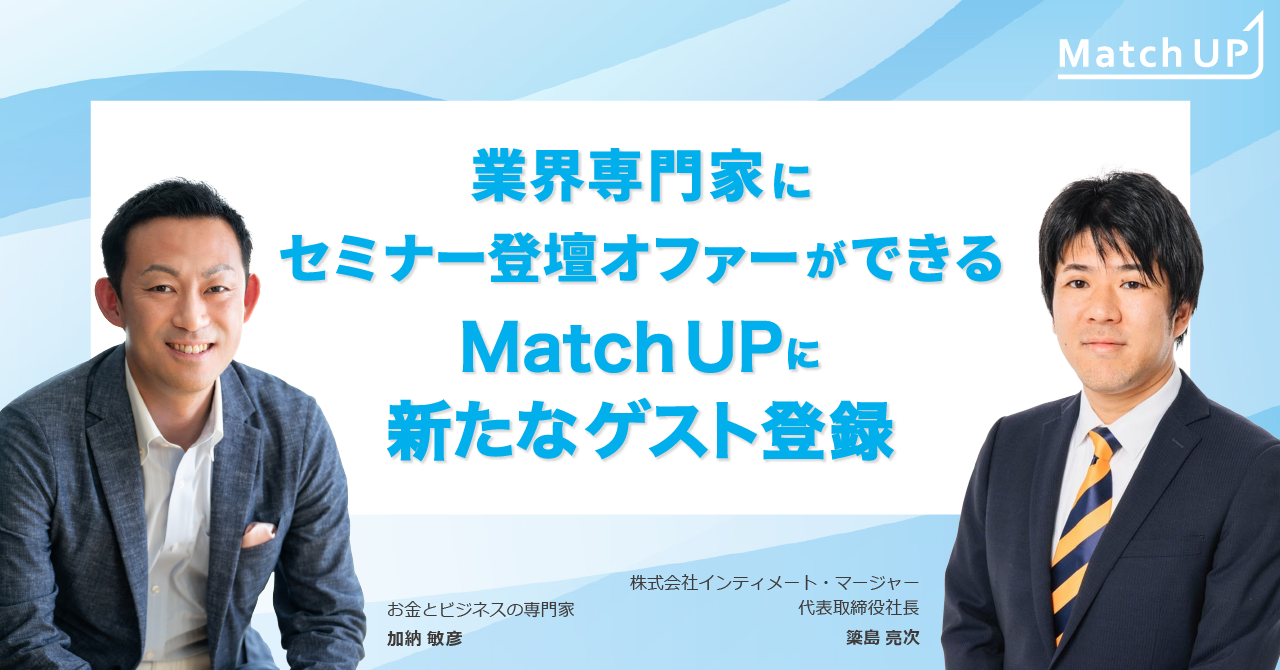 業界専門家にセミナー登壇オファーができる「Match UP」お金とビジネスの専門家 加納敏彦氏、インティメート・マージャー 簗島亮次氏が新たにゲスト登録