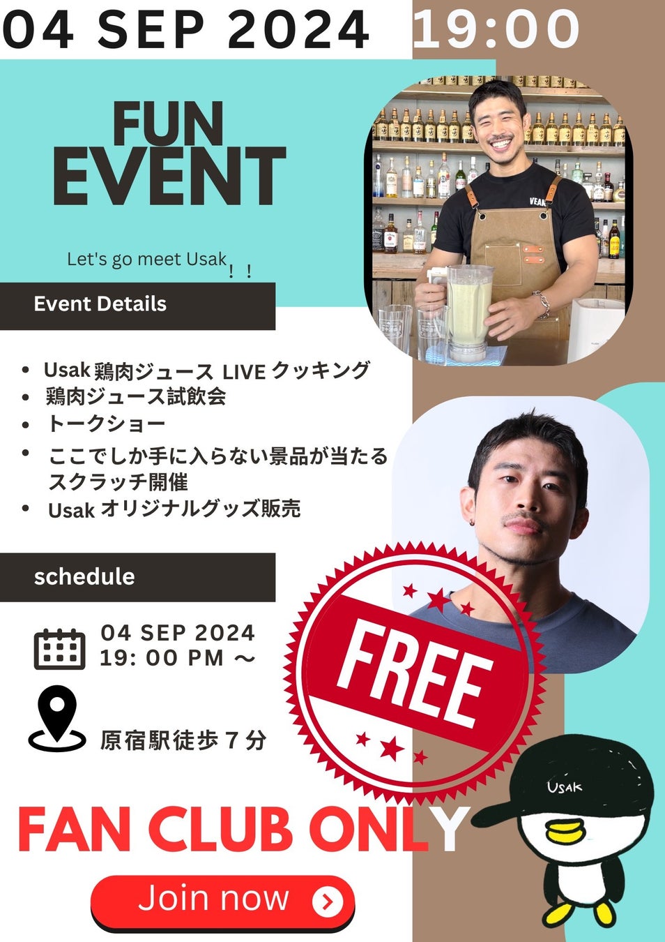 イベントでは、Usakお手製の「鶏肉ジュース」の試飲会や、ここでしか手に入らない景品があたるスクラッチなどを予定しています。