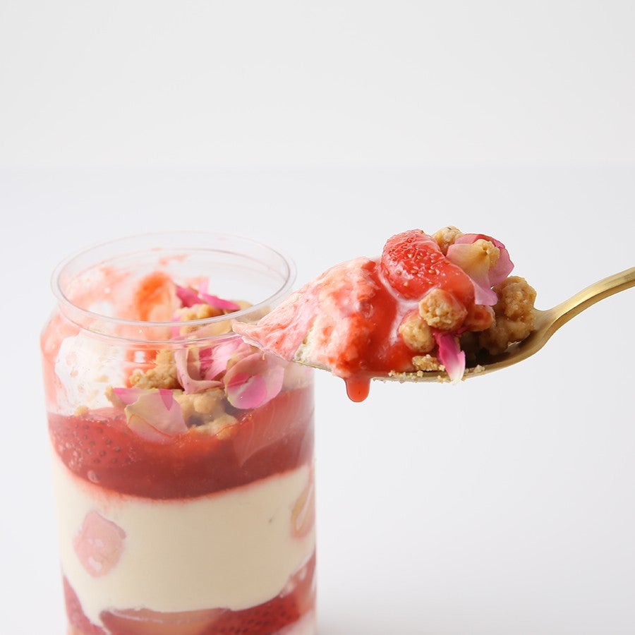 甘酸っぱいイチゴと可憐なローズの香りをたのしめる上品で大人なデザートです。苺ソース、クランブル、ムースフロマージュブラン、キルシュのジュレ、苺のコンポート、薔薇と紅茶のムース、スフレチーズケーキの7層で仕上げています。