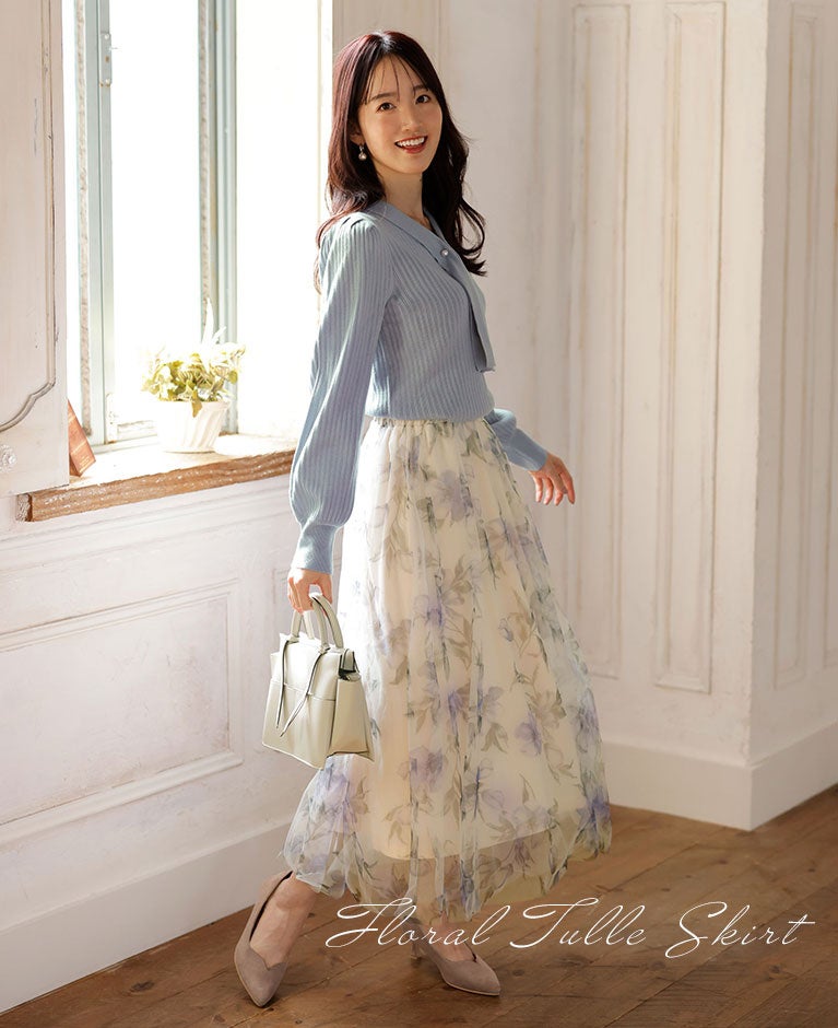 花柄プリントのチュールスカートは、コーデを華やかにしてくれるフェミニン派さんに欠かせない一品。ふんわりカラーとお花の組み合わせは、お仕事中の気分を上げてくれるシゴベ上げアイテムです。さらにボウタイ風ニットできちんと感を足すことで、オフィスでも映える装いになります。