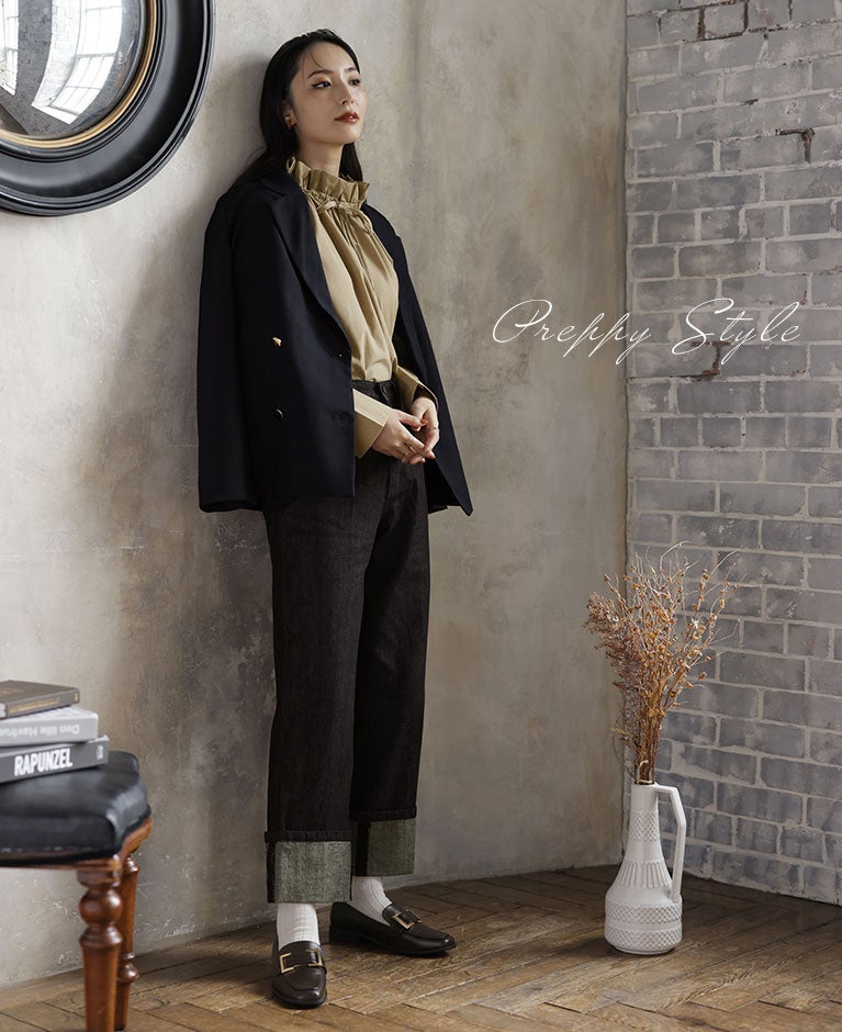 ジャケット×ブラウスにブラックデニムのパンツを合わせてちょっぴりカジュアルダウンした装いに。全体のトーンを抑えることで、デニムでもカジュアル過ぎないのがポイント。白ソックスにパンプスを合わせると、トレンドのプレッピースタイルが完成します。