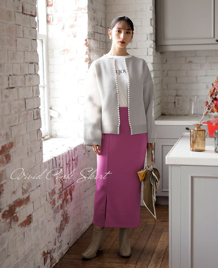 アクセサリーを身に纏ったようなカーデは、ノーネックレスでもコーデを華やかな印象に仕上げます。ボトムス以外は落ち着いた色でまとめるのがポイント。一見オフィスに取り入れづらいビビッドピンクは、タイトなシルエットのボトムスにすることでバランスがとれたファッションになります。