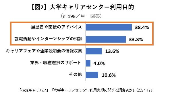 ・利用目的は、1位「履歴書や面接のアドバイス」(38.4%)、2位「就活やインターンシップの相談」(33.3%)。
