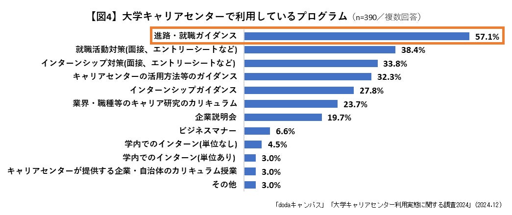・利用したことがあるプログラムの1位は「進路・就活ガイダンス」(57.7%)、今後利用したいプログラムの1位は「就活対策(面接、エントリーシートなど)」(63.3%)で、それぞれ全体の約6割を占める。