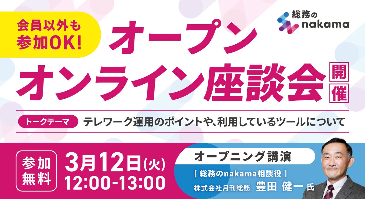 総務のnakamaは、通常、総務のnakama会員限定でオンライン勉強会等を開催していますが、より多くの方に総務のnakamaを知っていただきたいという思いから、この度、会員以外の方にもご視聴いただける「オープンオンライン座談会」を開催する運びとなりました。