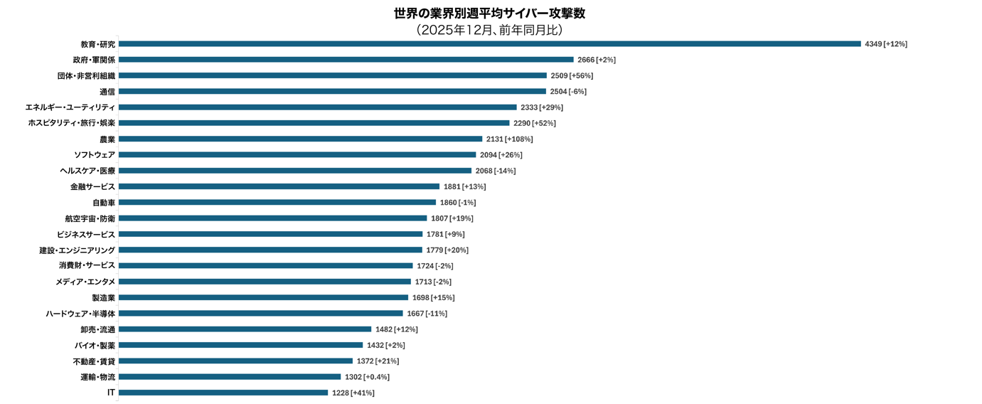 教育・研究分野は依然として世界的に最も多く標的とされ、2025年12月の1組織当たりの週平均攻撃数は、前年比12%増となる4,349件に上りました。教育・研究組織が引き続きサイバー犯罪者の格好の標的とされる理由は、ユーザー規模の大きさと、オープンなデジタル環境、老朽化したインフラにあります。