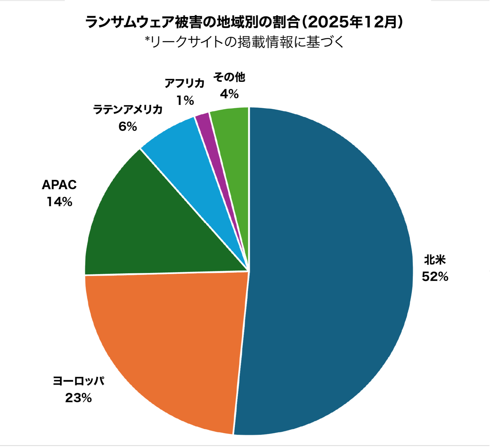 同時にランサムウェア攻撃も急増し、12月は前年同月比60%増となる945件の攻撃が公表されました。最も活発な活動を示したのは、日本でも2025年9月に発生した大手飲料企業への攻撃で大きく報じられたQilinで、公表された攻撃全体の18%を占めています。ランサムウェアは依然として世界的に最も事業に悪影響を及ぼすサイバー脅威となっており、さまざまな業界で業務の停止や経済的損失、データ恐喝を引き起こしています。ランサムウェア被害の報告件数は全体の52%を北米が占め、次にヨーロッパが23%と、経済的に価値の高い地域への集中が続いていることがあらためて確認されました。