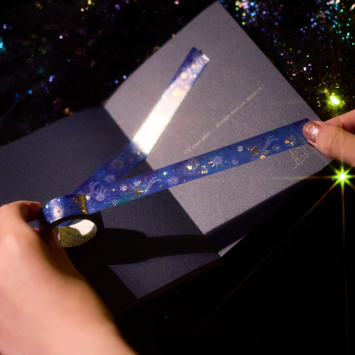 雑貨デザイナー・絵本作家のShinzi Katohデザイン「『きらぴか』マスキングテープ 星空」は、きらめく星空をモチーフにしたアイテム。和紙素材にゴールドホログラム箔をあしらい、メモやラッピングに、きらりと輝きをプラスします。