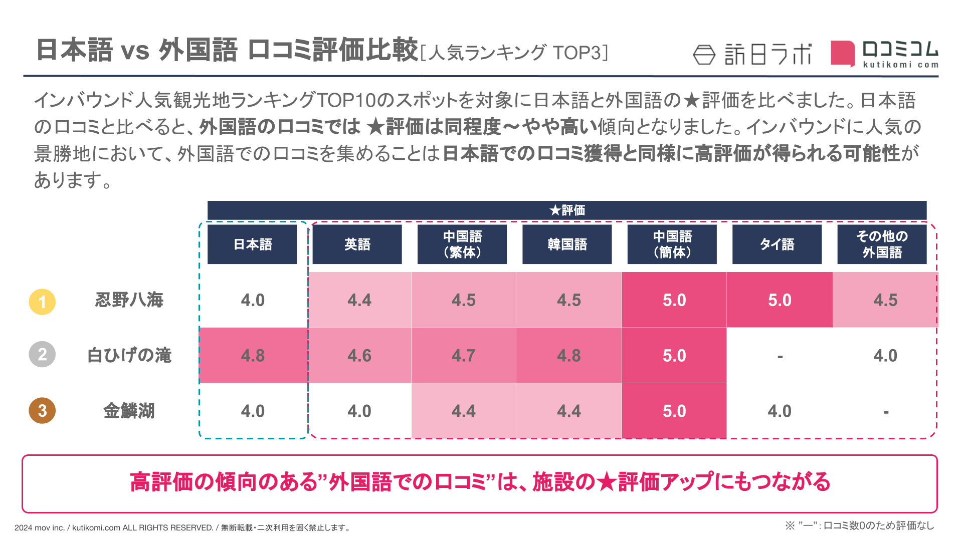 さらに本レポートでは、人気観光地TOP10の口コミ評価を言語別に算出。日本語と外国語との評価を比べてみると、ある特徴が見えてきました。