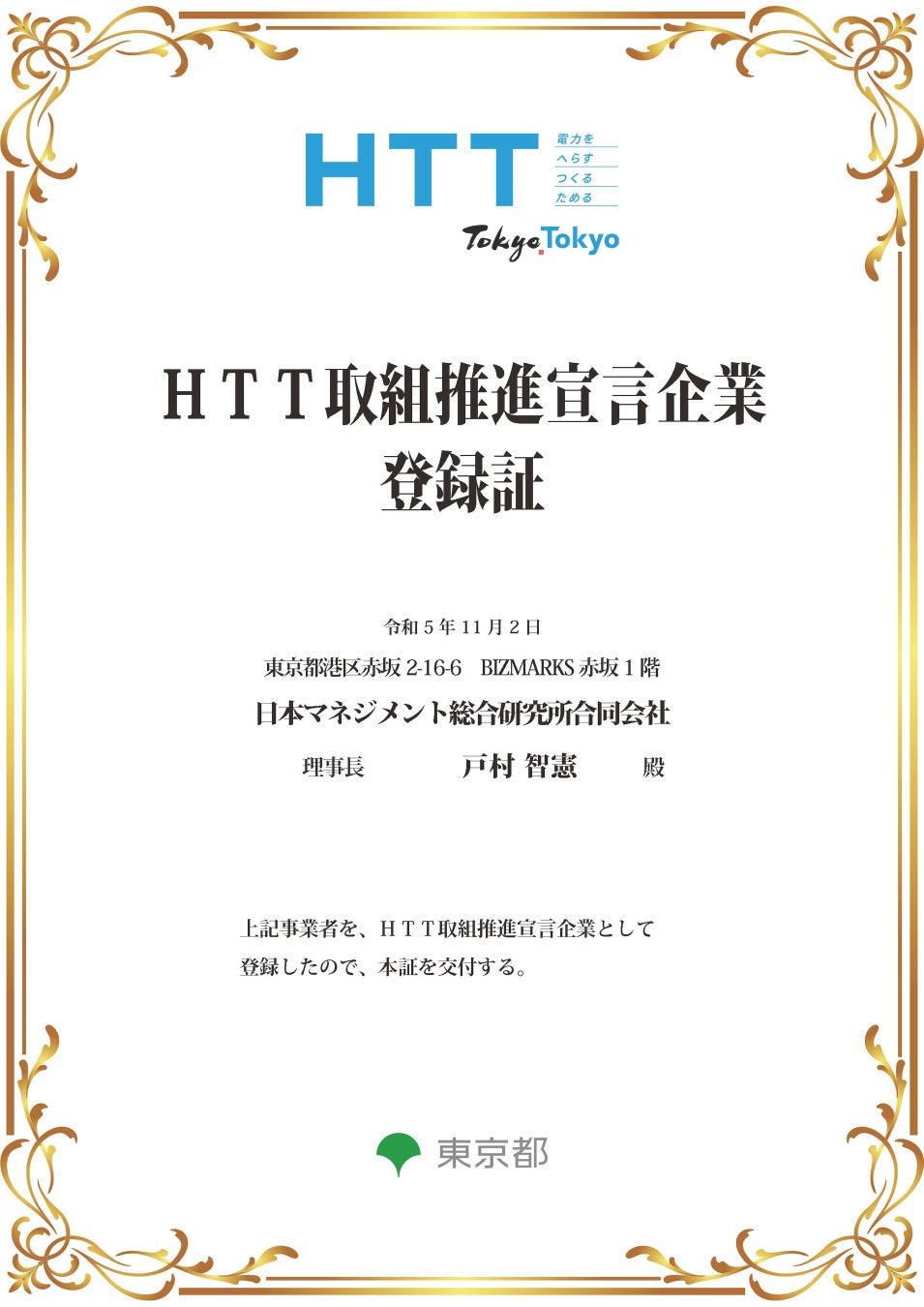 HTT取組推進宣言企業として弊社が参画・登録完了しました:電力のHTT(へらす、つくる、ためる)をキーワードにした東京都の取り組み【日本マネジメント総合研究所合同会社】