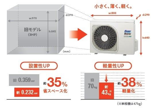 今回発売する室外機は、従来機と比べ、横幅を約18%減の800mm、高さを約25%減の640mm、奥行きを約22%減の290mmとし、大幅なコンパクト化を実現。また、重さも従来機より27kg減の43kgと大幅な軽量化を実現。これらにより、設置自由度の向上と運搬・施工時の利便性向上を両立しました。小型化に伴って運転音が大きくなる課題に対しては、風路の最適化や風量の最適制御を実施し、業界トップクラスの静音性※1を実現しています。さらに、効率性判断の公的基準である2015年省エネ法の基準値をクリア※2ならびに環境配慮の公的基準であるグリーン購入法※3の基準値をクリアし、高効率化と温室効果ガス排出削減を達成しています。