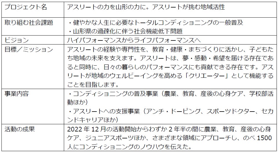 りのあるアスリートともに⼭形の地域の魅⼒向上と社会課題解決を⽬指す活動」の受賞を決定しまし