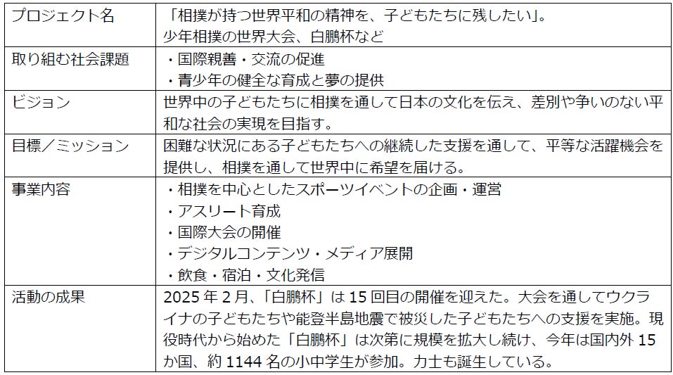 魅⼒を伝える取り組み「少年相撲の世界⼤会、⽩鵬杯などを通じて、相撲が持つ世界平和の精神を⼦