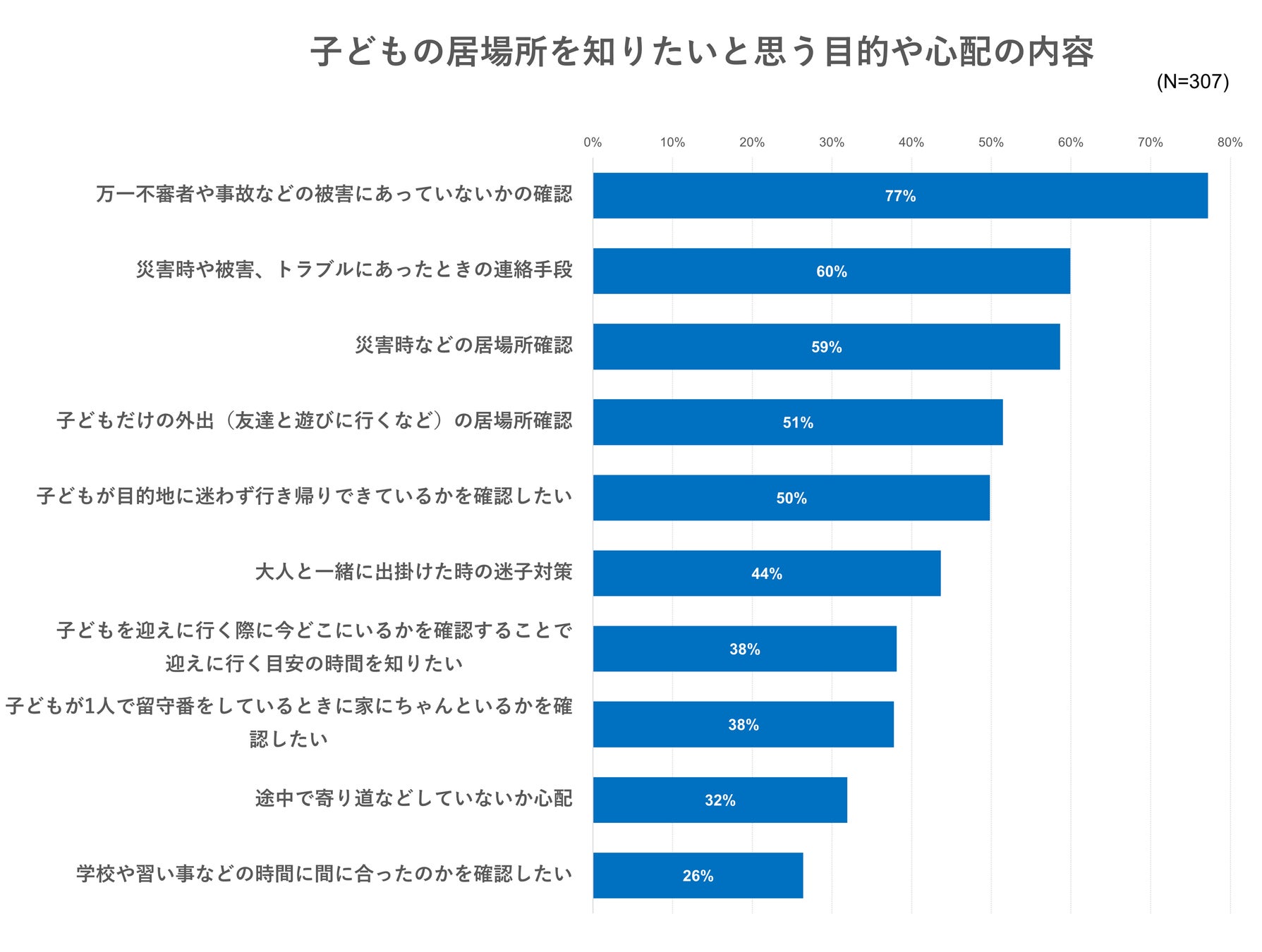 子どもの居場所を心配する保護者はとても多く、特に「子どもとはぐれた時」や「子どもだけで出かけたとき」「学校の行き帰り」などの場面で「居場所を知りたい」と感じていました。「万一不審者や事故などの被害にあっていないか」「災害時」などが特に不安視されています。