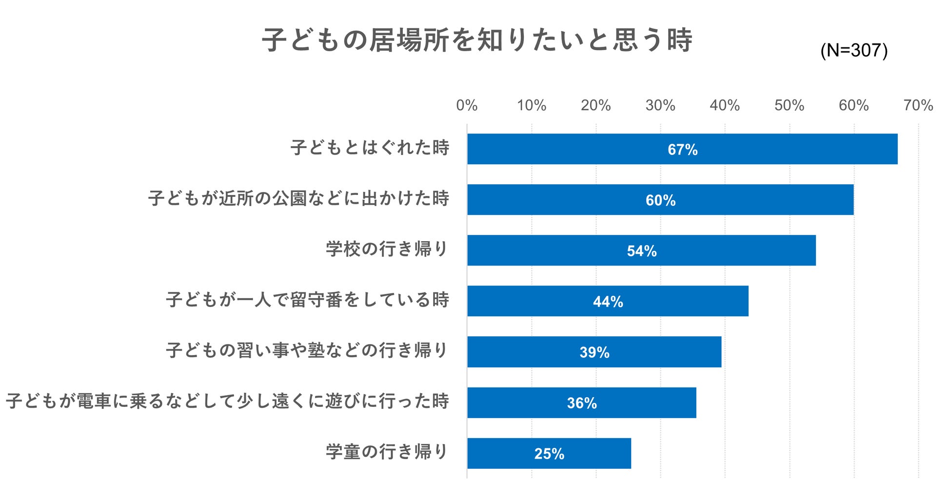 次いで、「子どもが近所の公園などに出かけた時」「学校の行き帰り」「1人で留守番している時」などの回答が続き、子どもが1人で行動している時に居場所を知りたいと思う状況も多いことが伺えます。