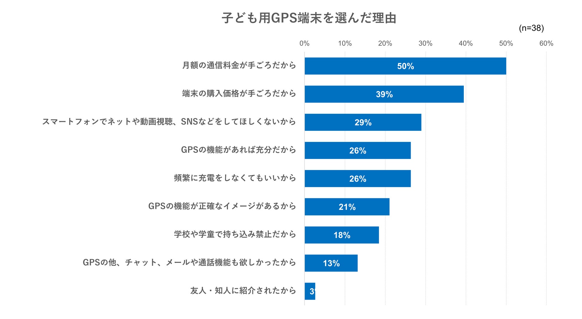 「月額の通信料金が手ごろだから」という理由が約50%で最多でした。つぎに、「端末の購入価格が手ごろだから」といったコスト的な理由が続いています。子ども用GPS端末は、他の端末よりもリーズナブルな料金が魅力のひとつです。位置情報がわかるアイテムを検討する上で、まずは価格的に利用しやすい子ども用GPS端末を選択する保護者も多いのではないでしょうか。