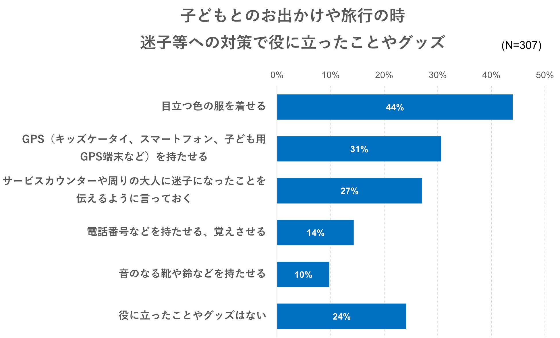 最も多かったのは、「目立つ色の服を着せる」という対策でした。まずは目視で居場所を素早く確認する方法を取り入れている様子が伺えます。