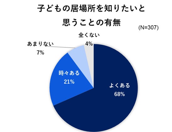 「よくある」が68%、「時々ある」が21%で、非常に多くの保護者が子どもの居場所を知りたいと思うことがあると回答しています。