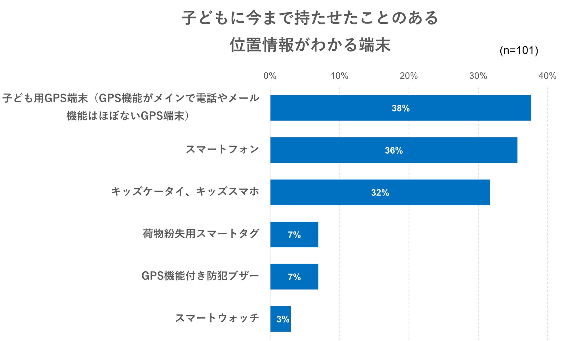 最多だったのは、「子ども用GPS端末」でした。つぎに、「スマートフォン」「キッズケータイ、キッズスマホ」が続いており、この3種の端末が多く利用されていることがわかりました。