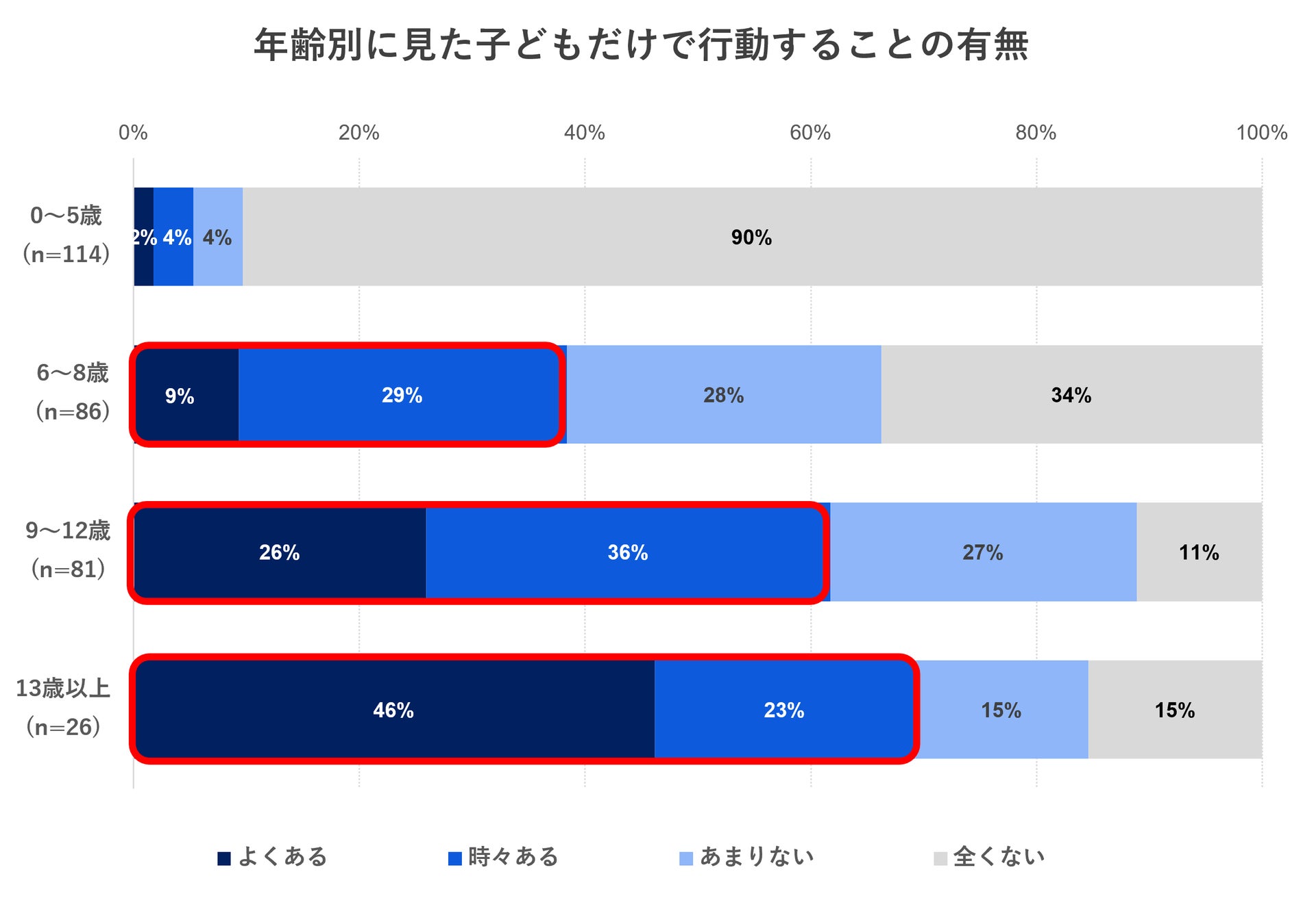 一方、子どもが1人で習い事や塾に行ったり留守番を1人でするなど、子どもだけで行動する機会も年齢とともに増え、小学校入学時から徐々に増加していきます。
