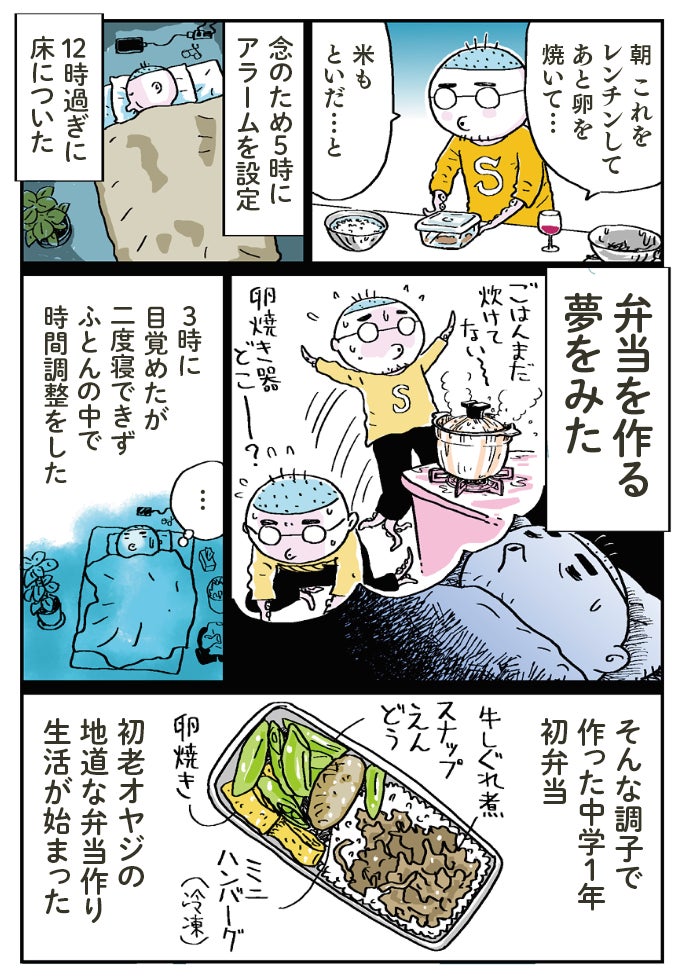 漫画家の吉田戦車さんがひとり娘の弁当を作り始めたのは2022年のこと。毎朝6時に起床して、朝食作りと同時に、前夜に下ごしらえを済ませた弁当作りに励みます。記念すべき初弁当は牛肉の切り落としを醤油・酒・みりん・砂糖・しょうがで味付けした「しぐれ煮」を用意。その詳細は第1話「初弁当・牛しぐれ煮」にてご覧ください。