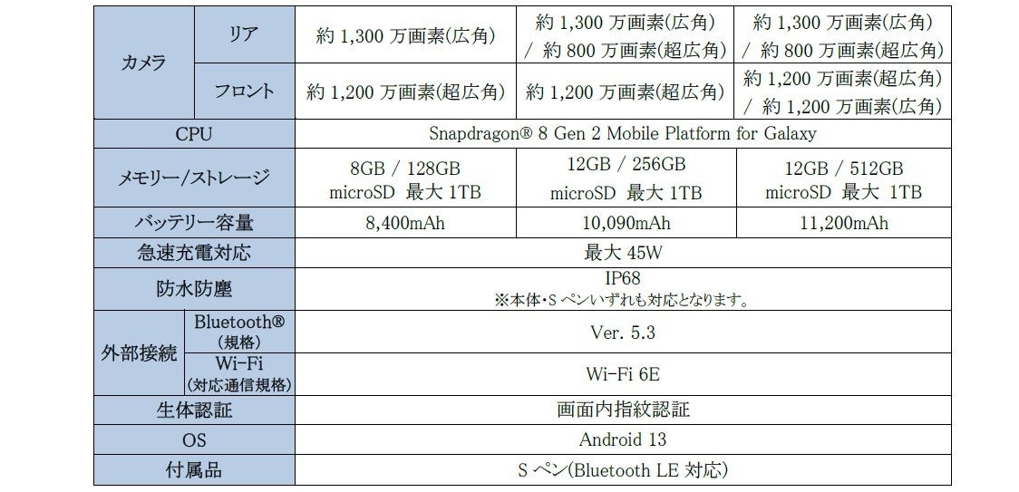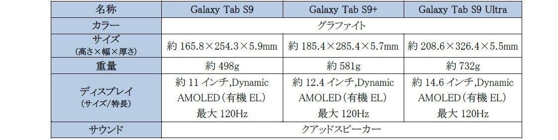 <主な仕様 : 「Galaxy Tab S9シリーズ」>