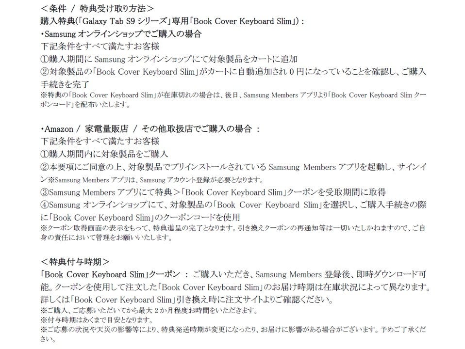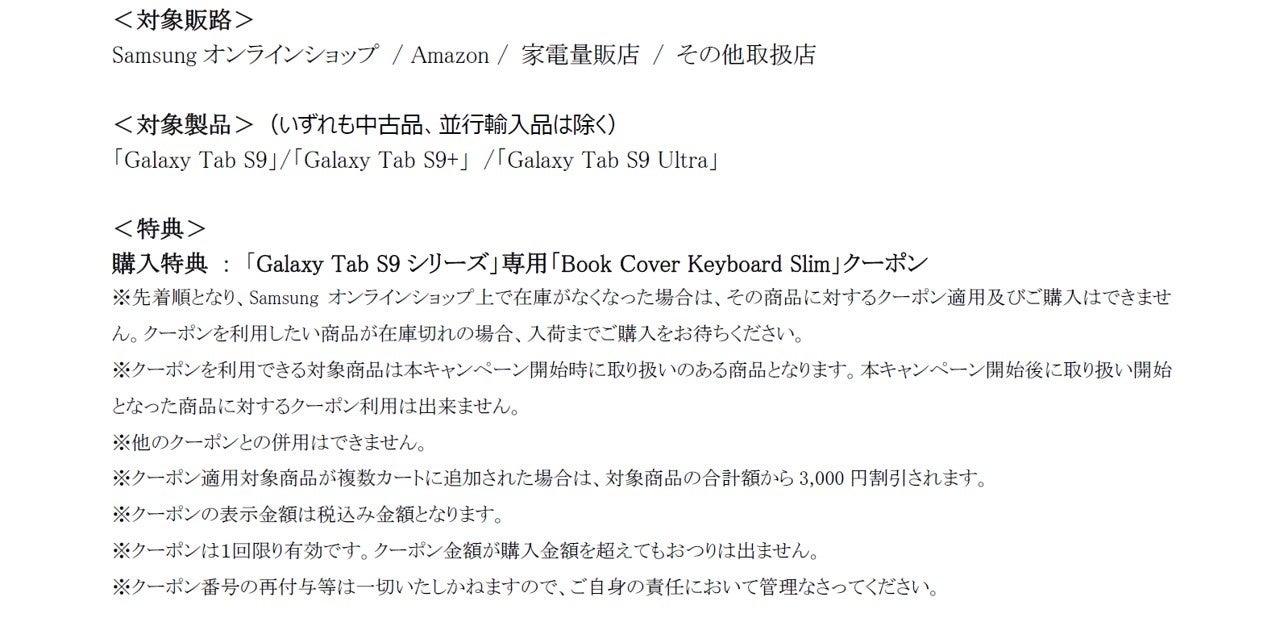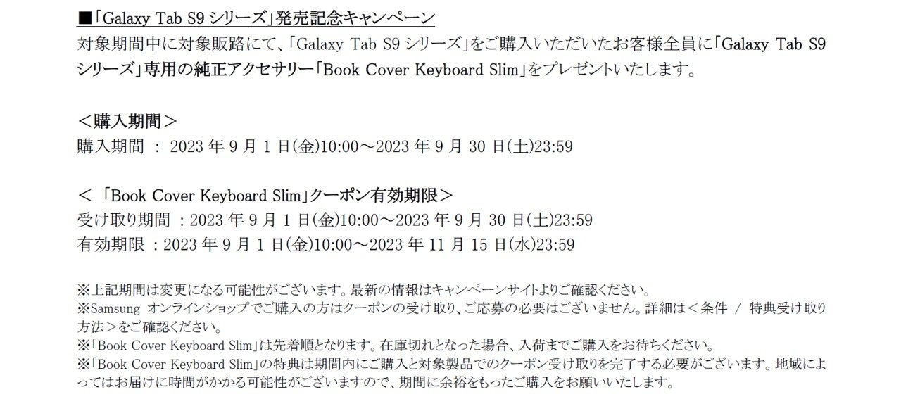 また、対象期間中に対象販路にて、「Galaxy Tab S9シリーズ」をご購入いただいたお客様全員に「Galaxy Tab S9シリーズ」専用の純正アクセサリー「Book Cover Keyboard Slim」をプレゼントする「発売記念キャンペーン」※を開催いたします。