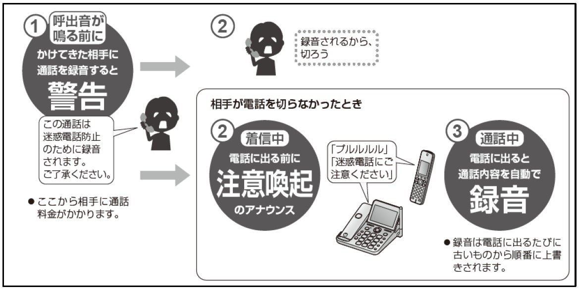 ※3 ナンバー・ディスプレイを利用している場合、親機の電話帳に登録されていない相手からかかってきた場合のみ迷惑防止の機能が働きます。またナンバー・ディスプレイについては、70歳以上の