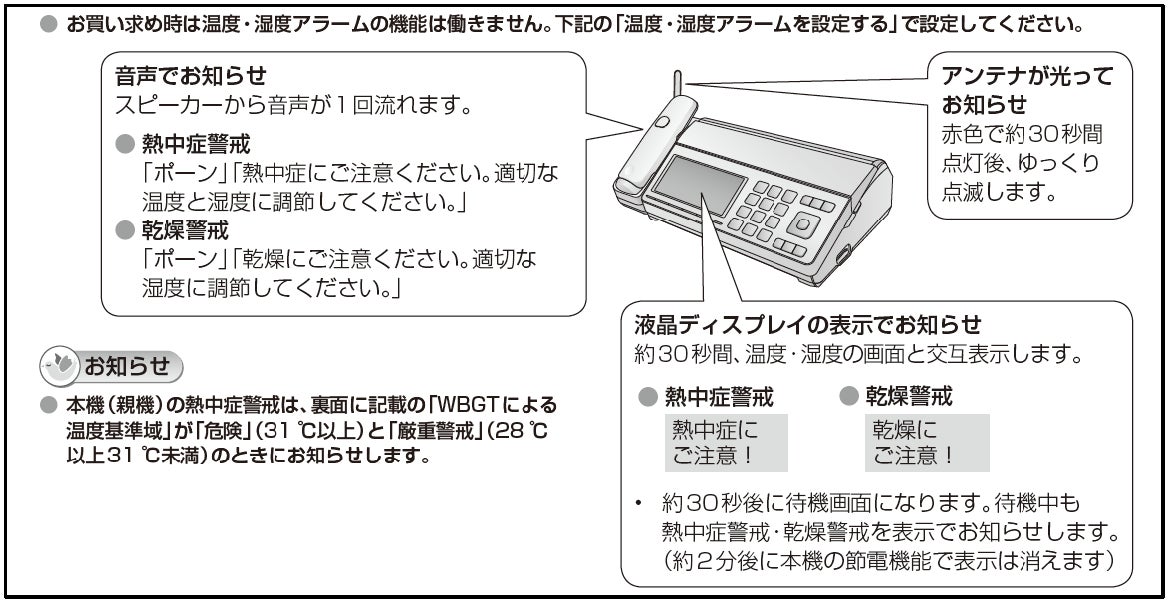 また本アラーム機能は、医療用、介護用、育児用、業務用などを目的としたものではありません。また、本機は熱中症発症、乾燥を防止できる製品ではありません。