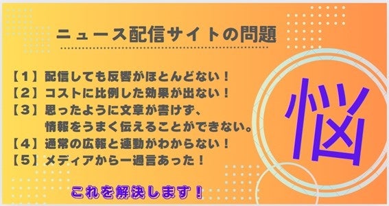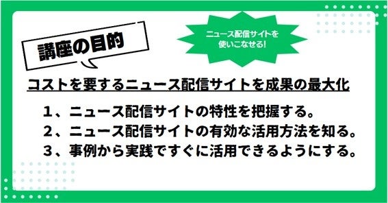 広報PRの講演で「ニュース配信サイトを利用している方から多くの質問や悩みを相談されます。「配信しても反響が少ない、もしくは全くない」「特に、大手メディアに掲載されない」「コストに比例した効果が出ない」など様々です。本講座は、これらの問題を解決しニュース配信サイトを最大限活用する手法をお教えます。ニュース配信サイトの仕組みと特長を理解した上で、成果を挙げ上手に活用している広報先進企業の事例を紹介します。その上で、具体的活用術、掲載されるニュース配信サイト用リリースの作成方法をレクチャーします。さらに、ニュース配信サイトの選別選定、活用する際の注意事項をお教えします。これら1つ1つ詳細かつ丁寧にポイント解説しますので、ニュース配信サイトの活用法を確実に習得できる講座です。