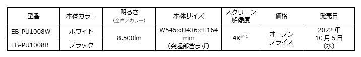 エプソンは、ビジネスプロジェクター高輝度モデルの新商品として、レーザー光源搭載の4K※1対応モデル『EB-PU1008W』(ホワイトモデル)、『EB-PU1008B』(ブラックモデル)の1機種2モデルを2022年10月5日(水)より発売します。
