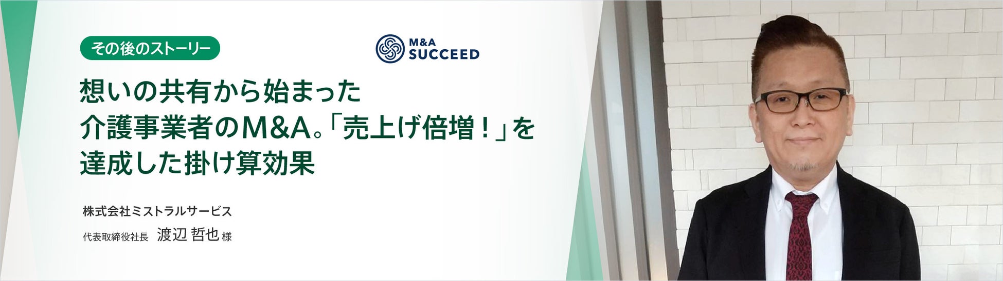 Visionalグループの株式会社M&Aサクシード(所在地:東京都渋谷区/代表取締役社長:金 蓮実)が運営する法人・審査制M&Aマッチングサイト「M&Aサクシード」(https://ma-succeed.jp/)を通じて、関東と関西で介護事業を展開する株式会社ミストラルサービス(所在地:京都府、以下:ミストラルサービス)は、横浜で20年にわたり介護事業を運営する有限会社ステップコーポレーション(所在地:神奈川県、以下:ステップコーポレーション)を譲り受け、1年半でステップコーポレーションの売上高倍増を達成しました。