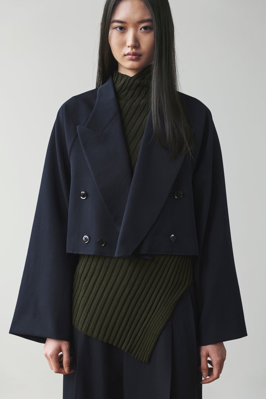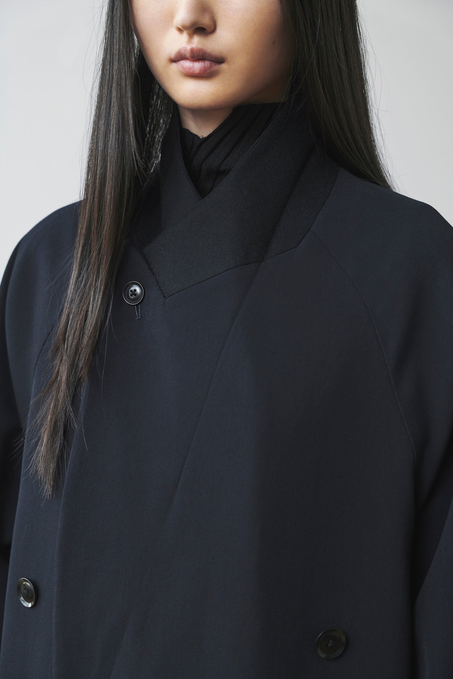厚手のウールギャバジン生地で仕立てられたテーラードシリーズのショートジャケット。しっかりした生地が、スマートな型をボリュームのある仕上がりに。ロングコートと同様の大きいラペルが付き、ボタンで閉めて着ることで、防寒とスタンドカラーのような雰囲気の変わったスタイルになる。裾が断ち切られ、品の良さと冬らしいボリューム感、勢いが内包されたジャケット。