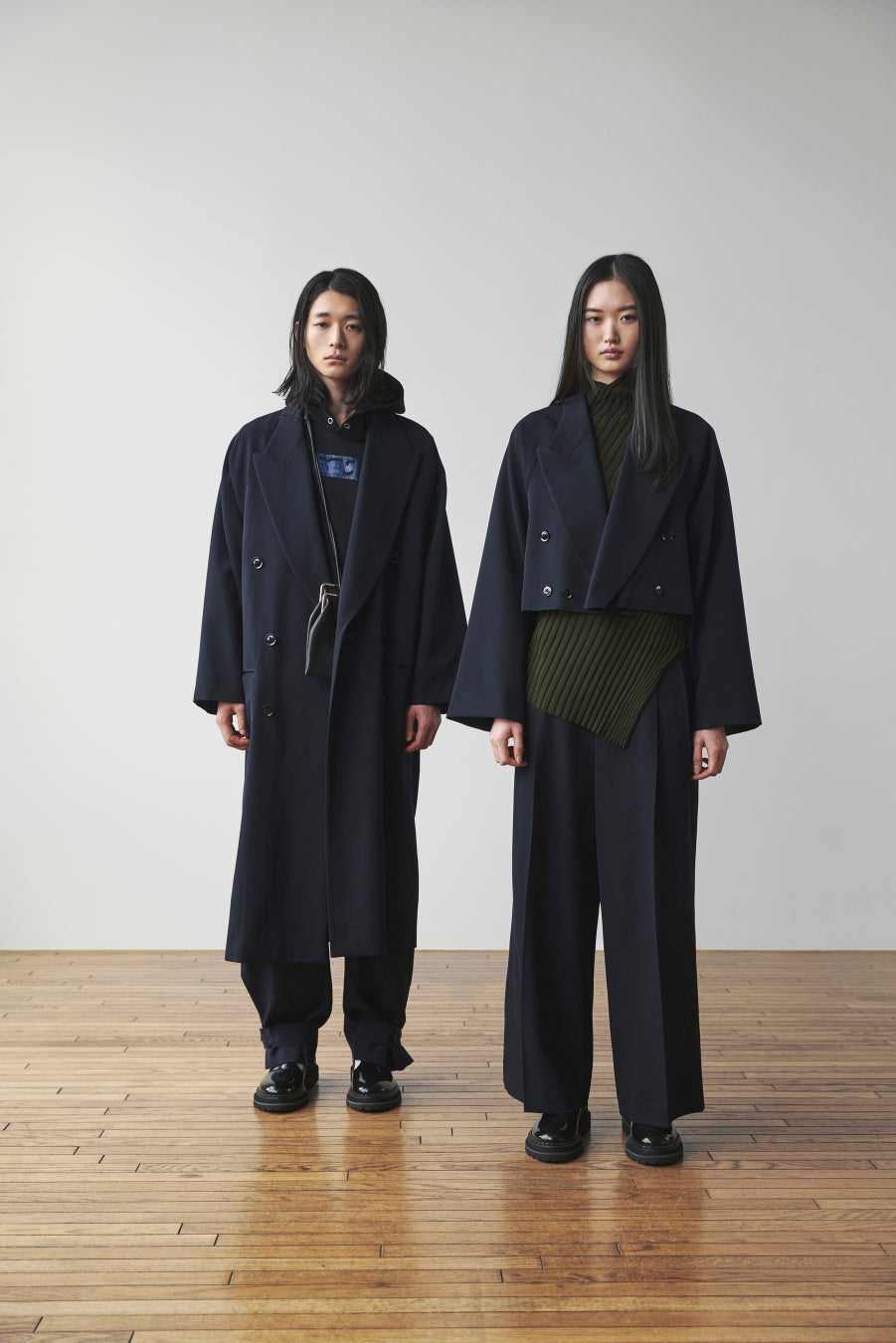 服のY'sネームがネイビーとグレイで構成され、ネームタグに受け手の余白を象徴するように付けられた「....」の記号が、ニュートラルに幅広さを加え、このラインのシルエットであることの目印です。