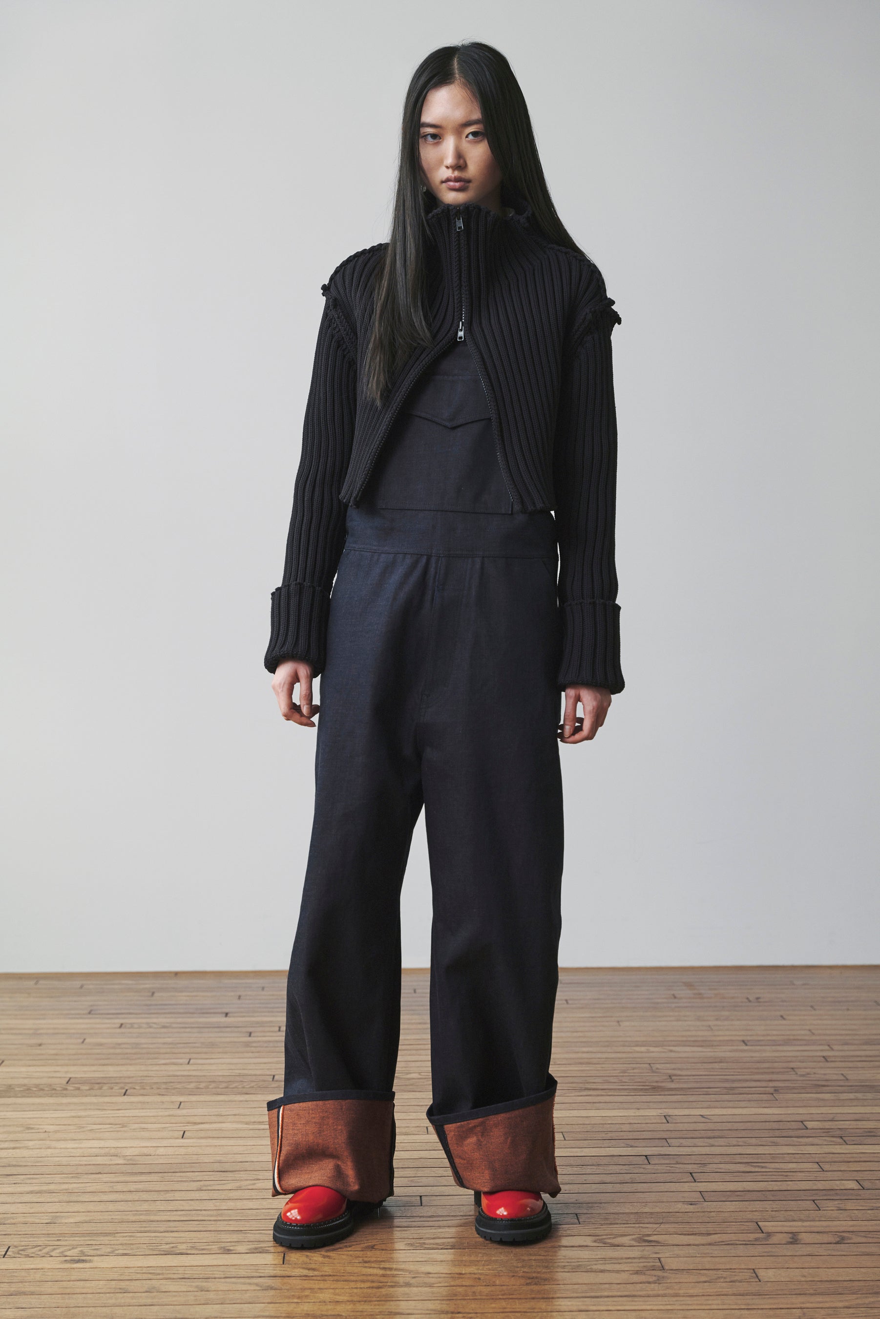 今シーズンの「Y's….」のシグネチャー、ヨコ糸にオレンジの糸を使用したデニムと、ロールアップのパンツスタイル。カラーがさり気なく取り入れられた裏側に朱色が覗くデニム。ワークジャケットが断ち切られてショート丈になったジャケットと、ロールアップで履くジーンズ。セットアップで着るユニークなデニムスタイル。
