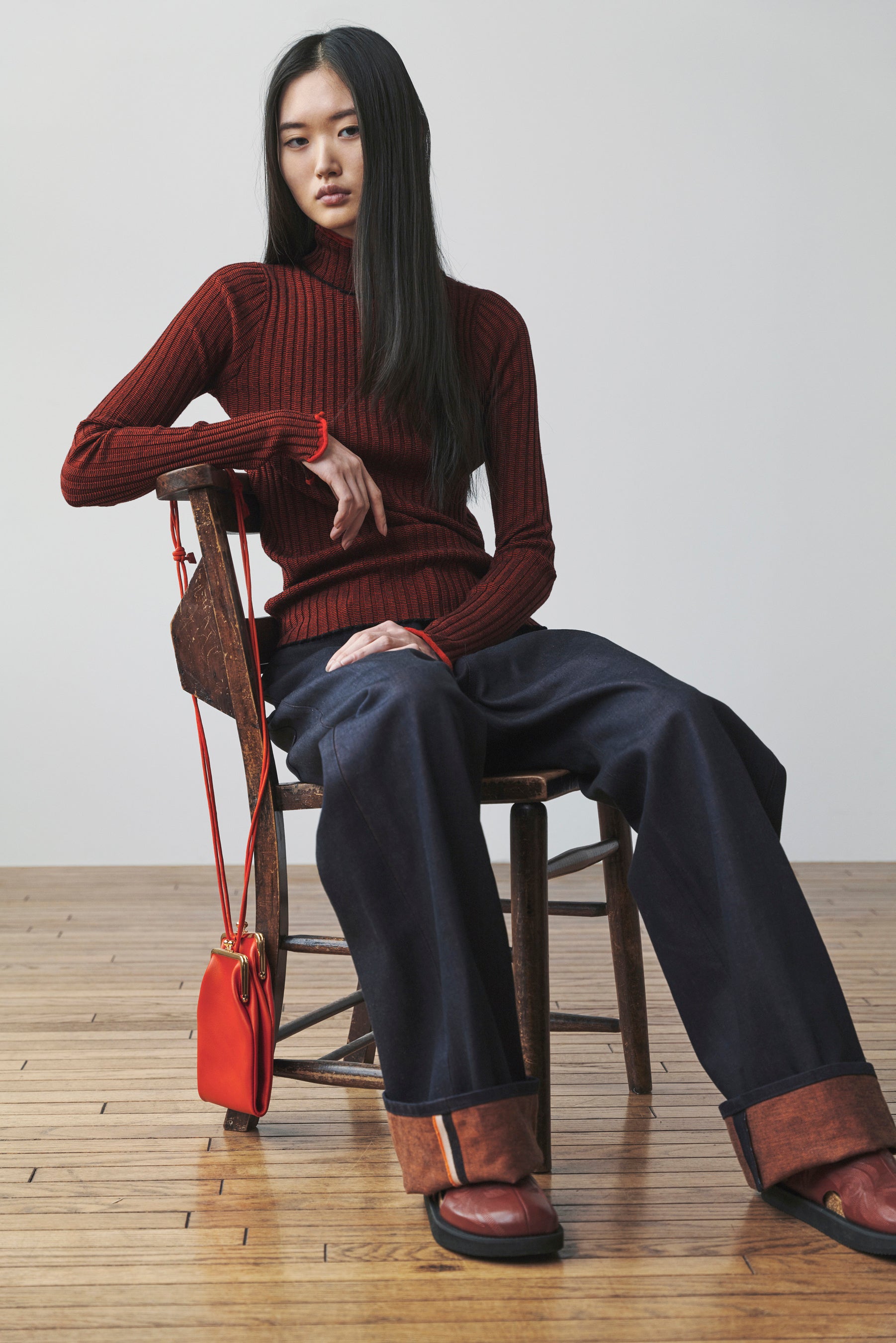 デニム生地と呼応するような、細かいボーダー柄のリブ編みハイネックニット。質感やニュアンスの違う赤をレイヤードする。