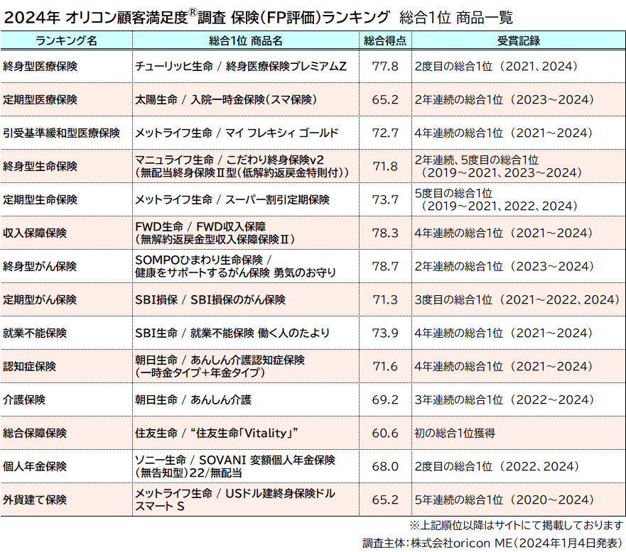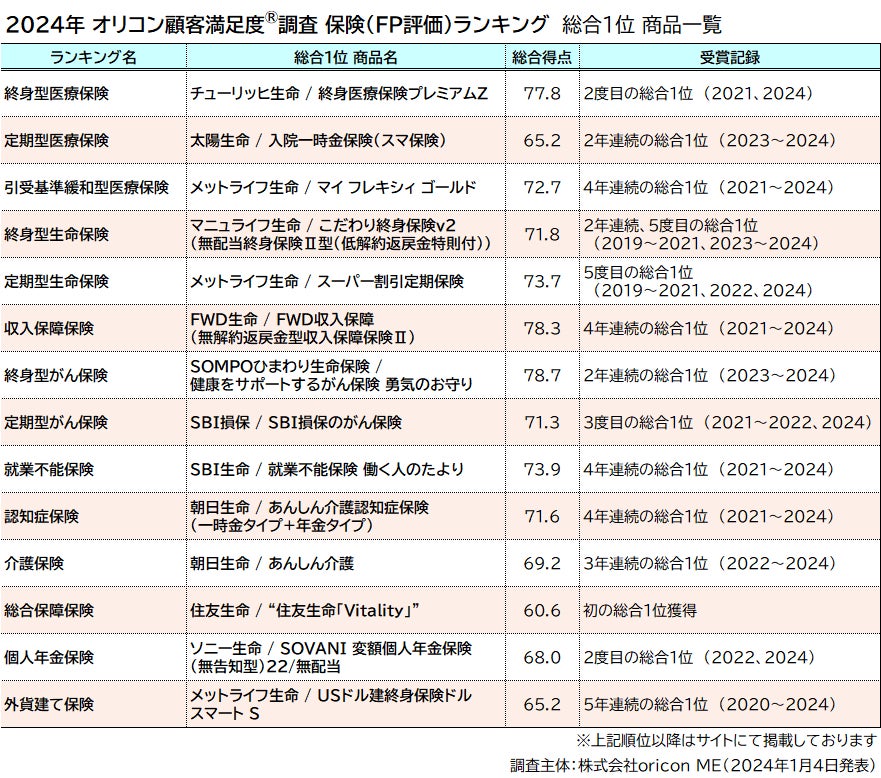 また、【メットライフ生命(メットライフ生命保険株式会社 本社:東京都千代田区)】の保険商品が、3ランキング(『引受基準緩和型医療保険』『定期型生命保険』『外貨建て保険』)で総合1位を獲得。『外貨建て保険』ランキングでは、2020年から5年連続の総合1位となりました。