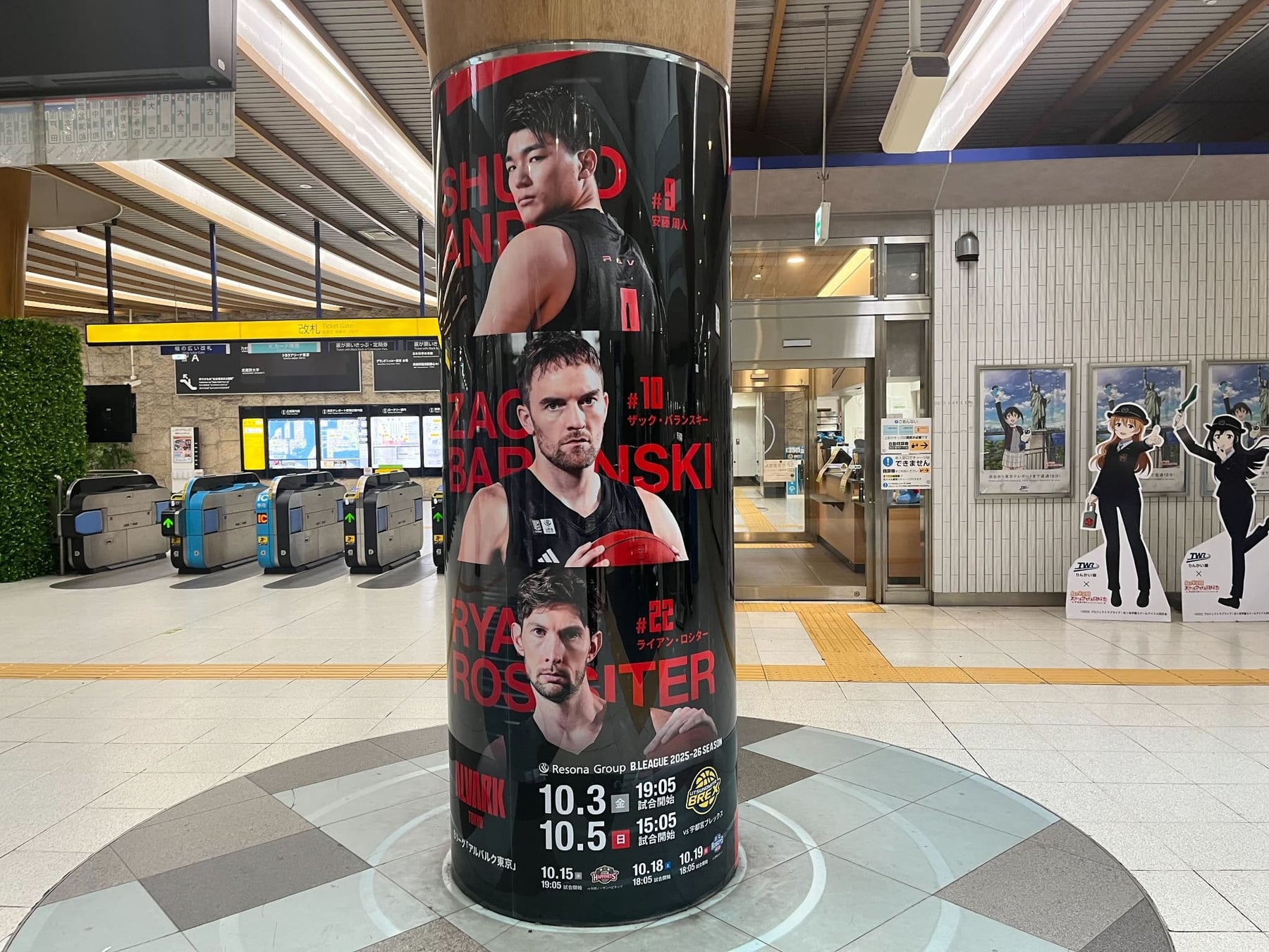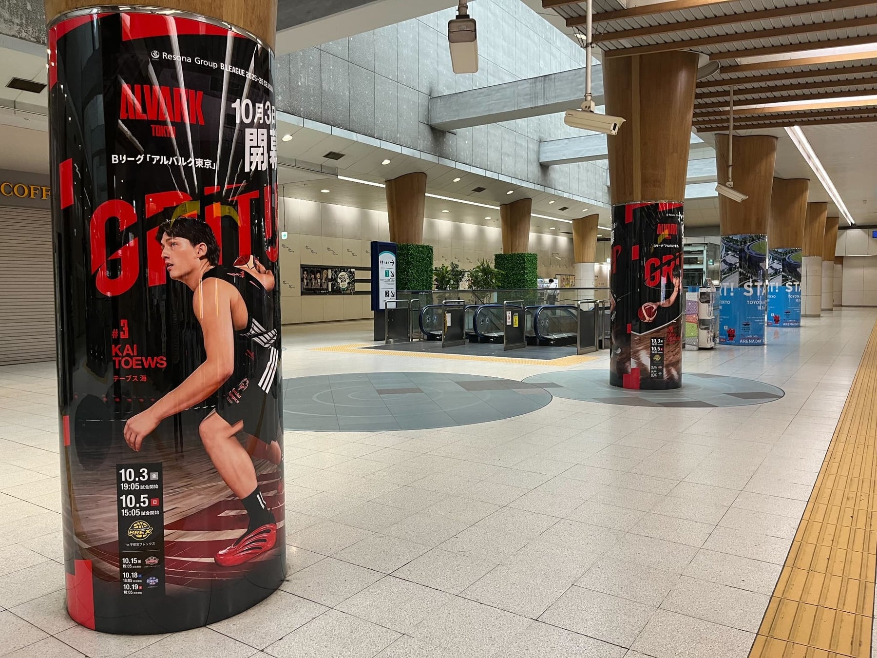 10月3日(金)りそなグループB.LEAGUE 2025-26の開幕にあわせ、「東京テレポート駅」の改札内もアルバルク東京の特別装飾を実施します。左上の壁面広告は10月19日(日)まで、その他の柱巻き広告は10月6日(月)まで掲出予定です。「東京テレポート駅」へお越しの際は、ぜひご覧ください。
