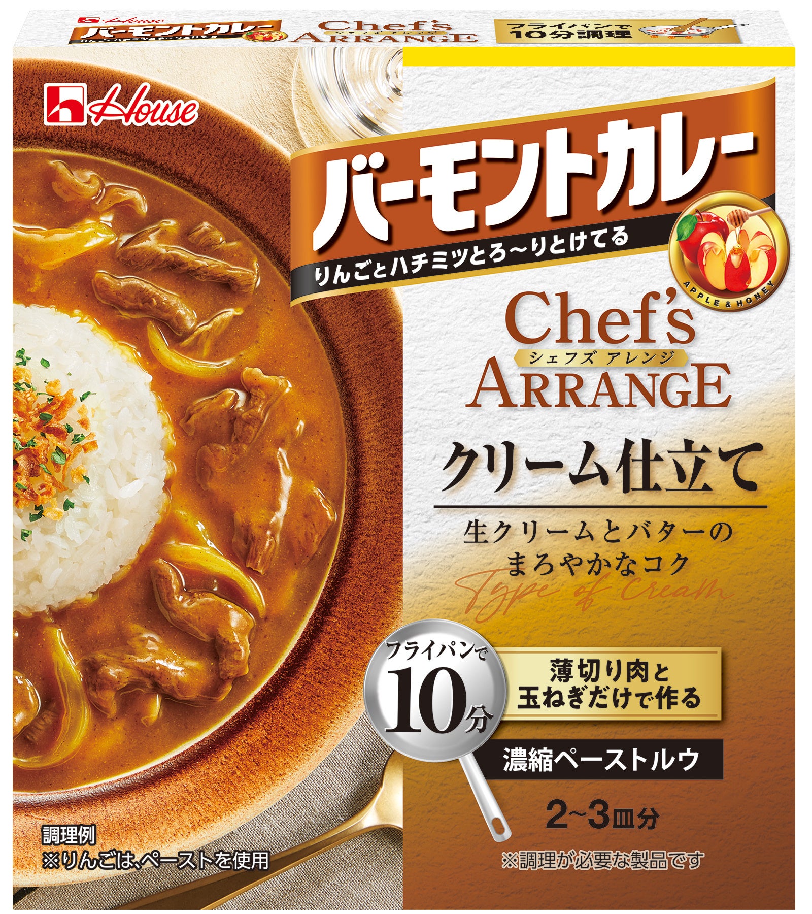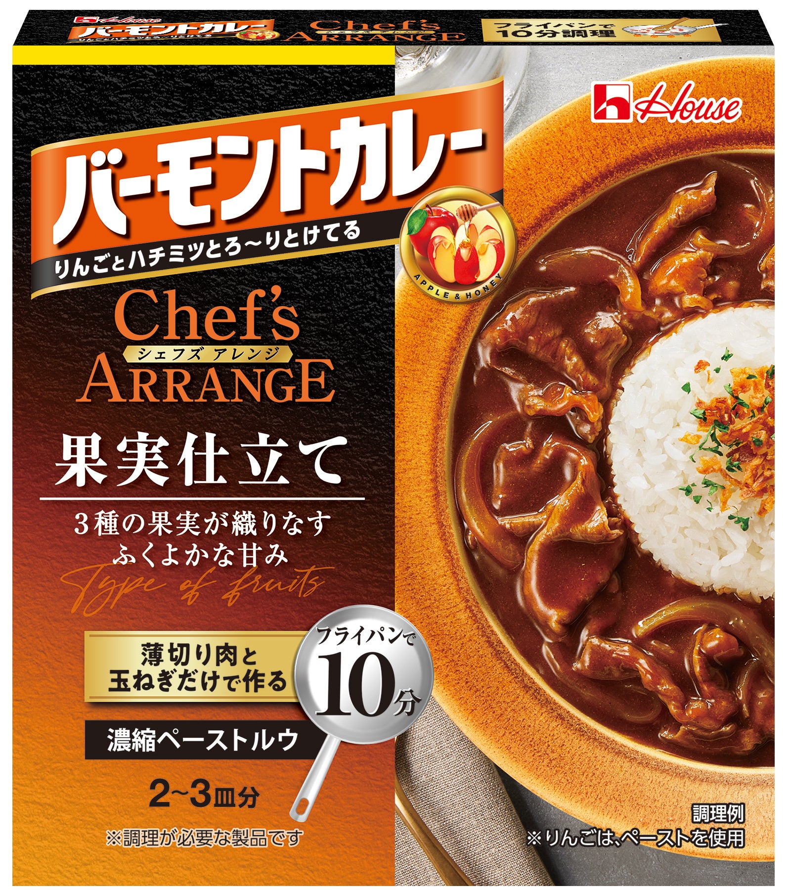 ハウス食品は、発売61年目を迎える国内売上No.1※カレーブランド「バーモントカレー」から、一流シェフの知恵を取り入れた濃縮ペーストルウ「バーモントカレーシェフズアレンジ」<果実仕立て><クリーム仕立て>を、2月12日からスーパーなどで発売します。「忙しいから時間をかけられないけれど、せっかく調理するなら美味しいものを食べたい」というお客様に対応した、シェフがアレンジしたような上質な味わいのカレーを、フライパンで10分調理するだけで手軽に楽しめる製品です。内容量は果実仕立て110g、クリーム仕立て108g、オープン価格(税別参考小売価格270円)。