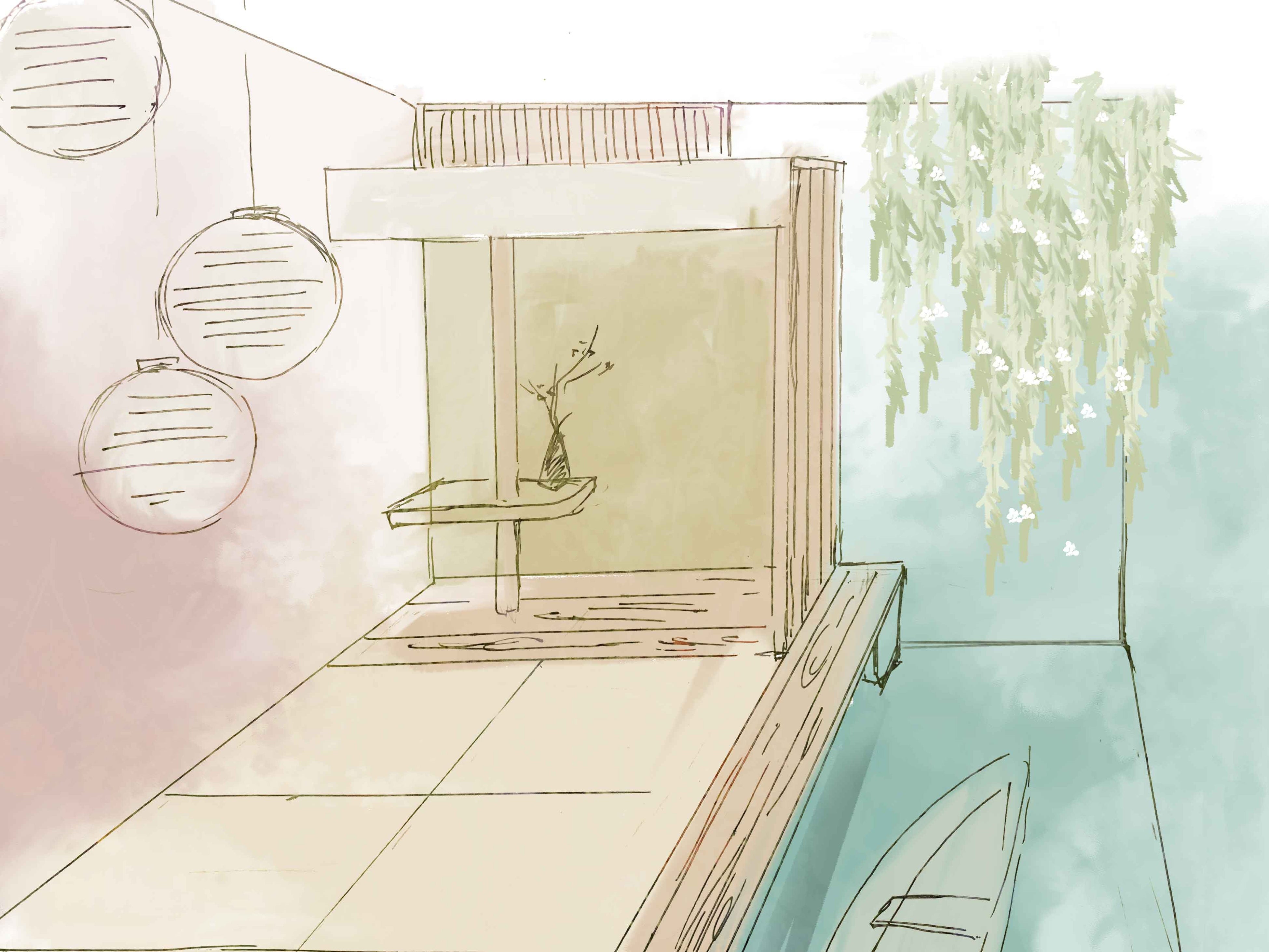 湖の上に浮かぶ現代的な和庭園と、奥の和室が織りなすファンタジーな和空間です。