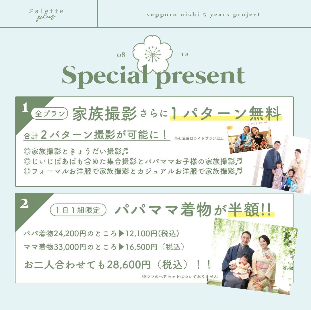 二つ目はパパママ着物が半額に。和空間で家族揃っての装いで、おしゃれに記念を残すことができます。