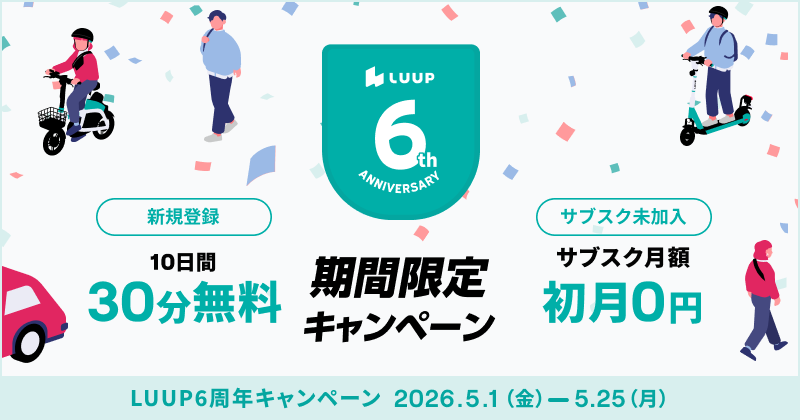 株式会社Luup(本社:東京都品川区、代表取締役CEO:岡井大輝、以下「Luup」)は、マイクロモビリティシェア「LUUP」のサービス開始6周年および累計アプリダウンロード数600万突破を記念し、2026年5月1日(金)から5月25日(月)まで、「6周年×600万人に選ばれたキャンペーン」を開催いたします。