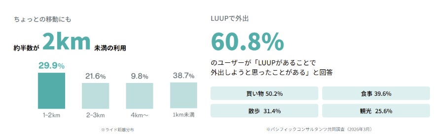 サービス提供開始から6周年を記念し、特設サイトを公開します。本サイトでは、LUUPが日常の交通手段として定着していることを示すデータを紹介しています。「2km未満のライドが約半数」「外出のきっかけになったユーザーが60.8%」に上るというデータから、その実態をご覧いただけます。